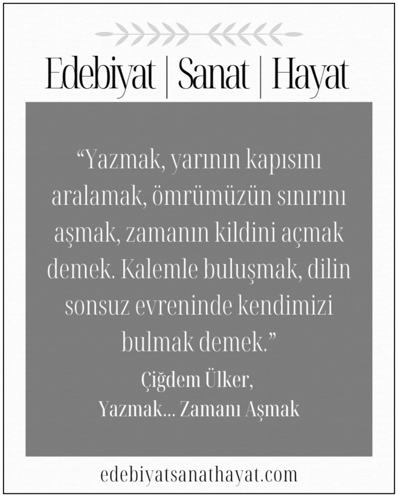 “Yazmak, yarının kapısını aralamak, ömrümüzün sınırını aşmak, zamanın kildini açmak demek. Kalemle buluşmak, dilin sonsuz evreninde kendimizi bulmak demek.