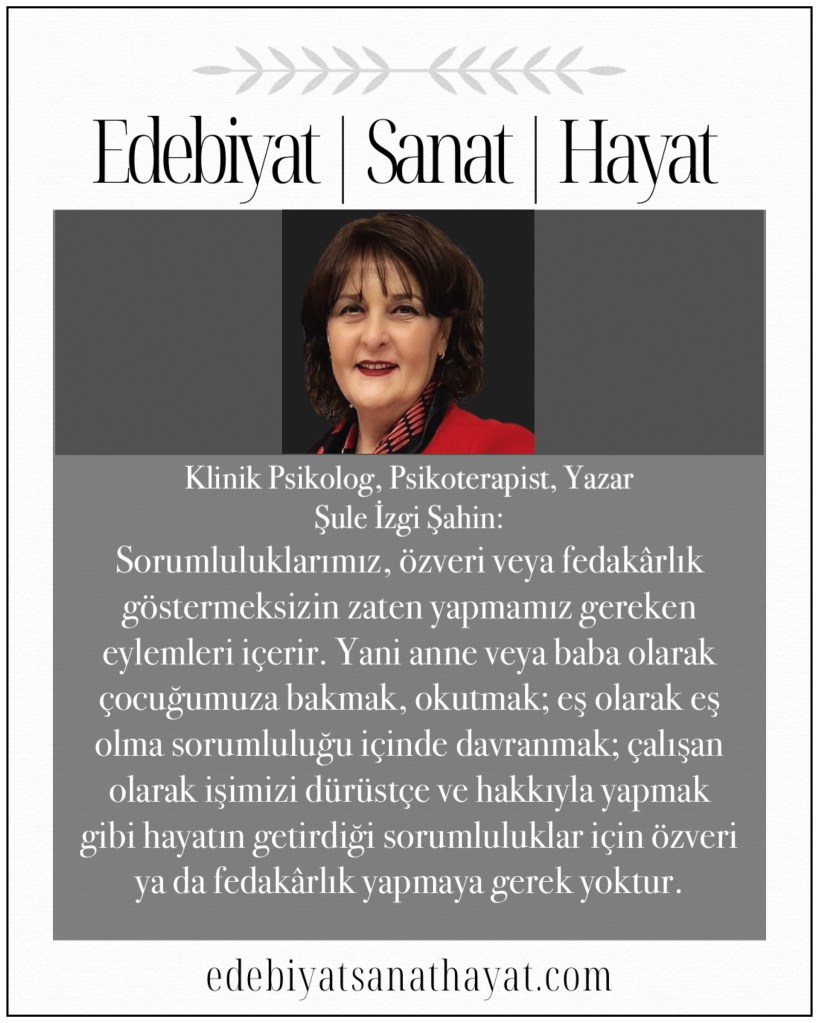 Psikolojik polisiye roman üçlemesi Kopmuş İp, Kocama Tuzak Kurdum, Kırmızı Kadifenin Sırrı eserleriyle tanınan, alanında benzersiz bir çalışma olan Romandrama’nın yazarı, ODTÜ Edebiyat Kulübü’nün kurucusu, Uzman Klinik Psikolog, Psikoterapist ve Yazar Şule İzgi Şahin; birbiriyle sıklıkla karıştırılan fedakârlık ve özveri kavramlarını, ilişkiler üzerindeki etkilerine yönelik merak edilenleri yanıtladığı köşe yazısıyla Edebiyat I Sanat I Hayat Dergisi’nde…