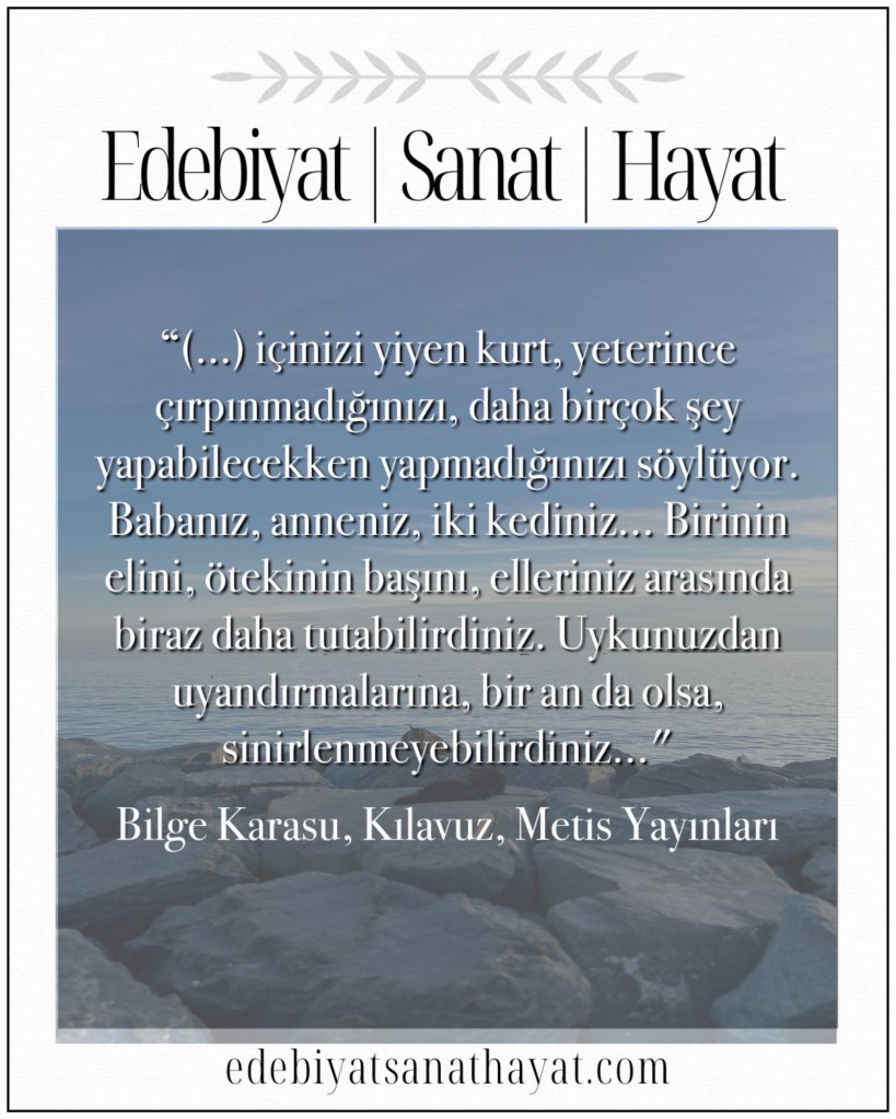 “Hepsi yakınınız; hepsi sevdiğiniz insanlar. Ara ara sevginizin yeğinliğine ya da tutsak ediciliğine dayanamayıp öldüklerini, kurdunuz, düşündünüz. Onları belki de öldürdüğünüzü, öldürttüğünüzü düşlediniz. Hiçbiri sizin elinizden ölmedi. Tersine, ulaşamadığınız bir ikisi dışında, baktınız onlara; öleceklerini belki bilerek, bekleyerek, belki de bilmeyerek, paralarsınız acılarını biraz olsun hafifletmek için… Ama hepsini bir arada düşündüğünüzde, içinizi yiyen kurt, yeterince çırpınmadığınızı, daha birçok şey yapabilecekken yapmadığınızı söylüyor. Babanız, anneniz, iki kediniz… Birinin elini, ötekinin başını, elleriniz arasında biraz daha tutabilirdiniz. Uykunuzdan uyandırmalarına, bir an da olsa, sinirlenmeyebilirdiniz…”