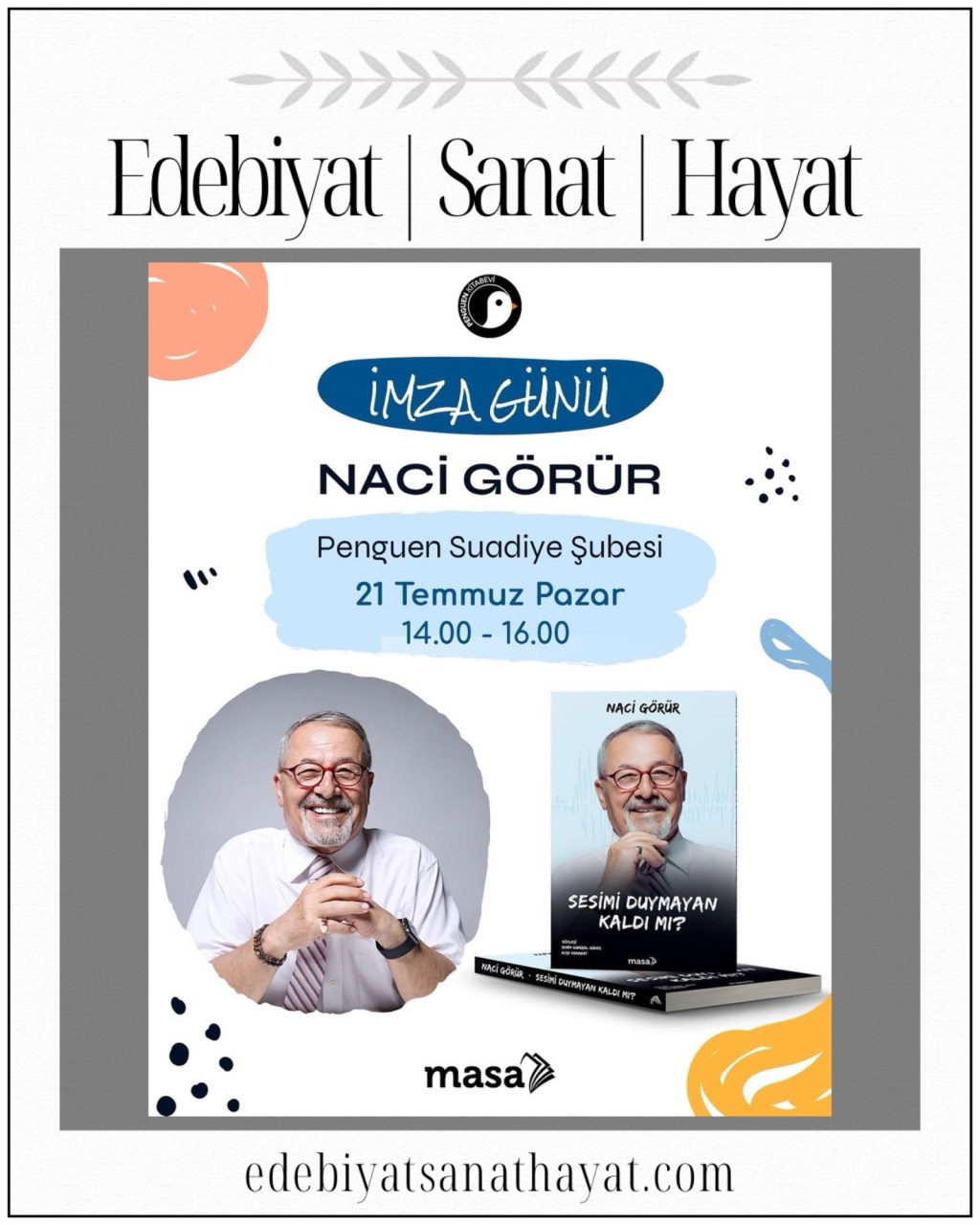 Prof. Dr. Naci Görür, Masa Kitap etiketiyle raflarda yerini alan nehir söyleşisi “SESİMİ DUYMAYAN KALDI MI?” ile 21 Temmuz Pazar günü Penguen Suadiye’de okurlarıyla buluşacak.