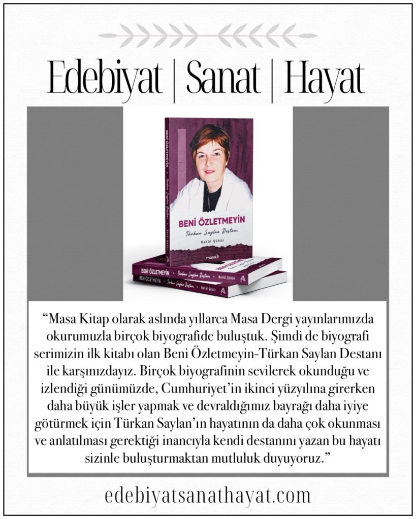 “Masa Kitap olarak aslında yıllarca Masa Dergi yayınlarımızda okurumuzla birçok biyografide buluştuk. Şimdi de biyografi serimizin ilk kitabı olan Beni Özletmeyin-Türkan Saylan Destanı ile karşınızdayız. Birçok biyografinin sevilerek okunduğu ve izlendiği günümüzde, Cumhuriyet’in ikinci yüzyılına girerken daha büyük işler yapmak ve devraldığımız bayrağı daha iyiye götürmek için Türkan Saylan’ın hayatının da daha çok okunması ve anlatılması gerektiği inancıyla kendi destanını yazan bu hayatı sizinle buluşturmaktan mutluluk duyuyoruz.”