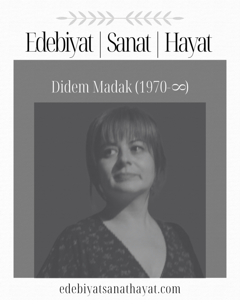 Didem Madak, İzmir doğumlu (1970-23 Temmuz 2011). Liseyi İzmir’de tamamladı. Dokuz Eylül Üniversitesi Hukuk Fakültesi’ni bitirdi. İlk şiirleri Sombahar ve Ludingirra dergilerinde yayımlandı. İlk kitabı Grapon Kâğıtları (2000) ile İnkılâp Kitabevi Şiir Ödülü’nü aldı. Sonraki yıllarda iki kitabı daha yayımlandı: Ah’lar Ağacı (2002) ve Pulbiber Mahallesi(2007). 2008’de kızı Füsun dünyaya geldi. Şairin bu üç kitabının Metis’te yaptığımız tekrar basımları okurlardan geniş ilgi gördü. (Metis Kitap)