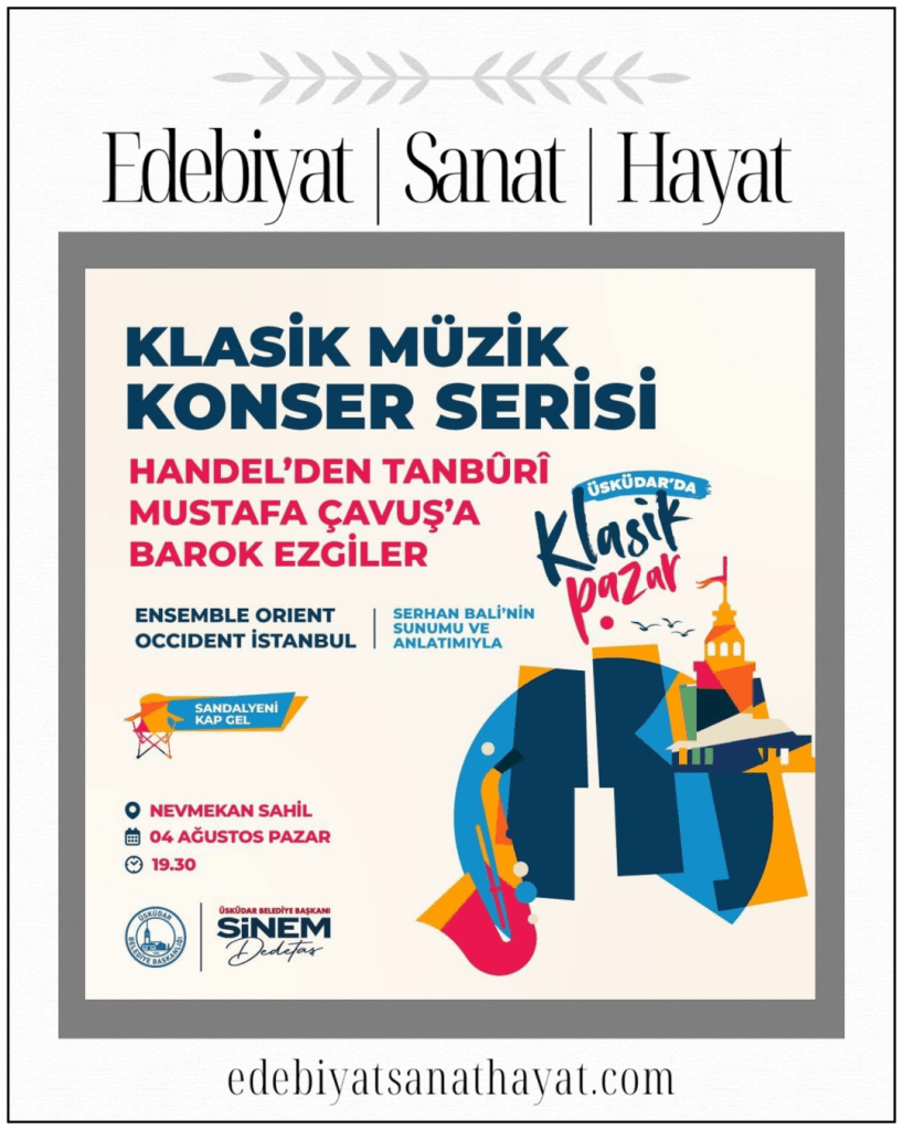 Ensemble Orient-Occident İstanbul konseri, Serhan Bali’nin sunumu ve anlatımıyla 4 Ağustos Pazar akşamı 19.30-21.00’da NevMekân Sahil Alt Bahçe’de gerçekleşecek. Üsküdar’ın kültürel atmosferine katkı sunması amacıyla, Üsküdar Belediye Başkanı Sinem Dedetaş’ın ev sahipliğinde “Klasik Pazar” teması altında verilecek “Handel’den Mustafa Çavuş’la Barok Ezgiler” açık hava konserine katılım ücretsiz…
