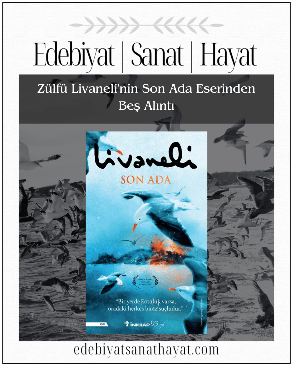 Araştırmalarım ile ilgili nereye gittiysem, benden önce bir şairin oraya uğradığını gördüm” diyen Freud, âdeta Zülfü Livaneli’nin Son Ada kitabında soluklanmış gibidir. Bu değerli eserde, martılara karşı açılan savaş, insan türünün bitmez tükenmez hırsları ve iktidar mücadelesi anlatılır.