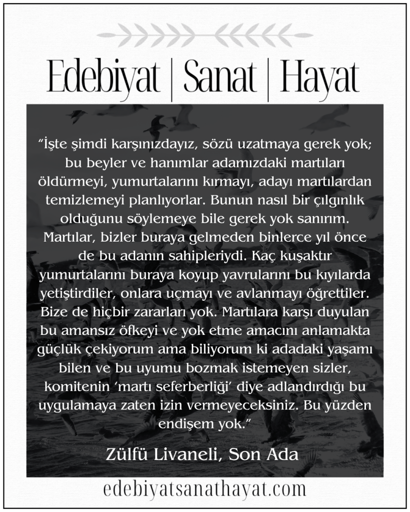“İşte şimdi karşınızdayız, sözü uzatmaya gerek yok; bu beyler ve hanımlar adamızdaki martıları öldürmeyi, yumurtalarını kırmayı, adayı martılardan temizlemeyi planlıyorlar. Bunun nasıl bir çılgınlık olduğunu söylemeye bile gerek yok sanırım. Martılar, bizler buraya gelmeden binlerce yıl önce de bu adanın sahipleriydi. Kaç kuşaktır yumurtalarını buraya koyup yavrularını bu kıyılarda yetiştirdiler, onlara uçmayı ve avlanmayı öğrettiler. Bize de hiçbir zararları yok. Martılara karşı duyulan bu amansız öfkeyi ve yok etme amacını anlamakta güçlük çekiyorum ama biliyorum ki adadaki yaşamı bilen ve bu uyumu bozmak istemeyen sizler, komitenin ‘martı seferberliği’ diye adlandırdığı bu uygulamaya zaten izin vermeyeceksiniz. Bu yüzden endişem yok.” (Sayfa: 68)
