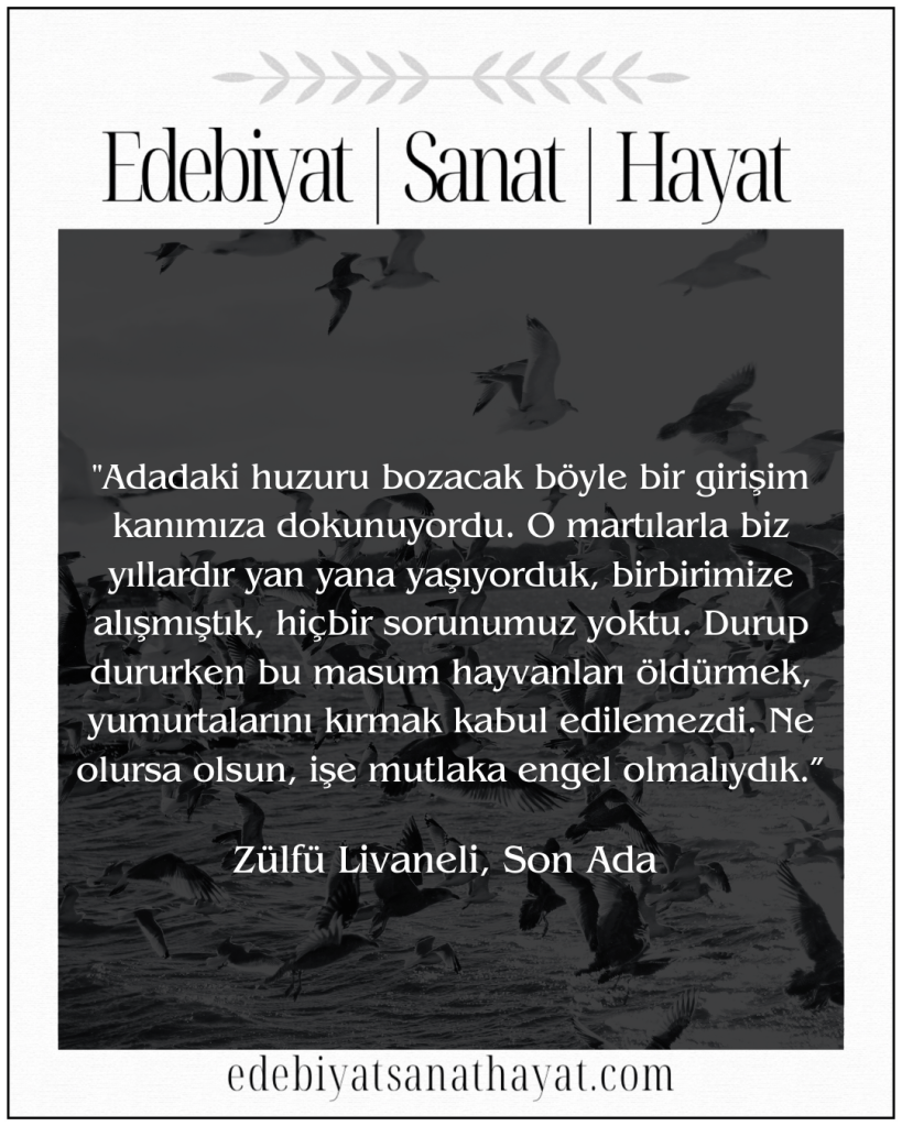 “Adadaki huzuru bozacak böyle bir girişim kanımıza dokunuyordu. O martılarla biz yıllardır yan yana yaşıyorduk, birbirimize alışmıştık, hiçbir sorunumuz yoktu. Durup dururken bu masum hayvanları öldürmek, yumurtalarını kırmak kabul edilemezdi. Ne olursa olsun, işe mutlaka engel olmalıydık.” (Sayfa: 77)
