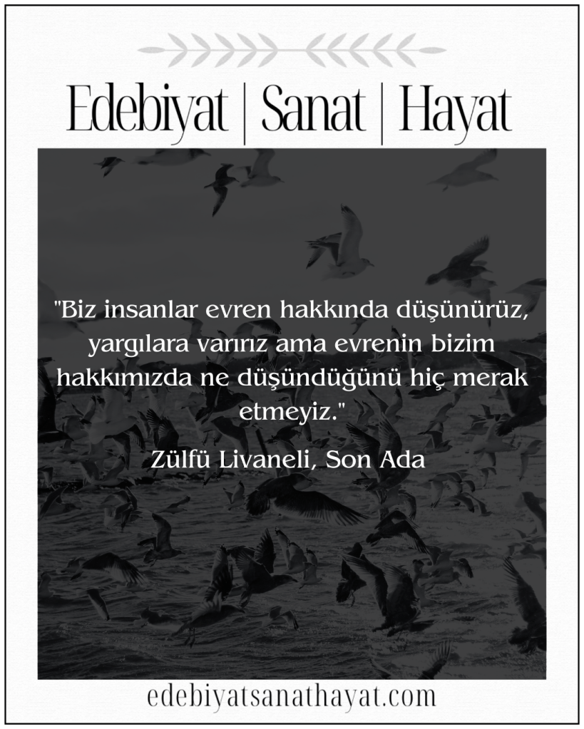 “Biz insanlar evren hakkında düşünürüz, yargılara varırız ama evrenin bizim hakkımızda ne düşündüğünü hiç merak etmeyiz.” (Sayfa: 89)