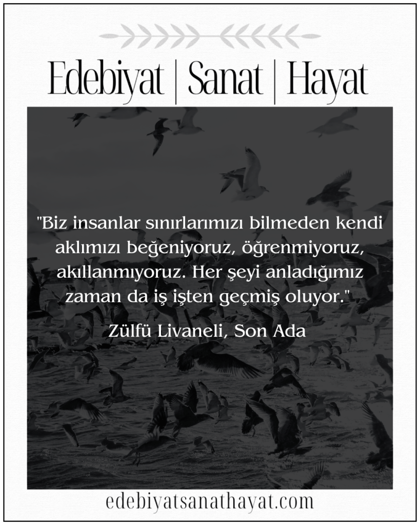 “Biz insanlar sınırlarımızı bilmeden kendi aklımızı beğeniyoruz, öğrenmiyoruz, akıllanmıyoruz. Her şeyi anladığımız zaman da iş işten geçmiş oluyor.” (Sayfa: 96)