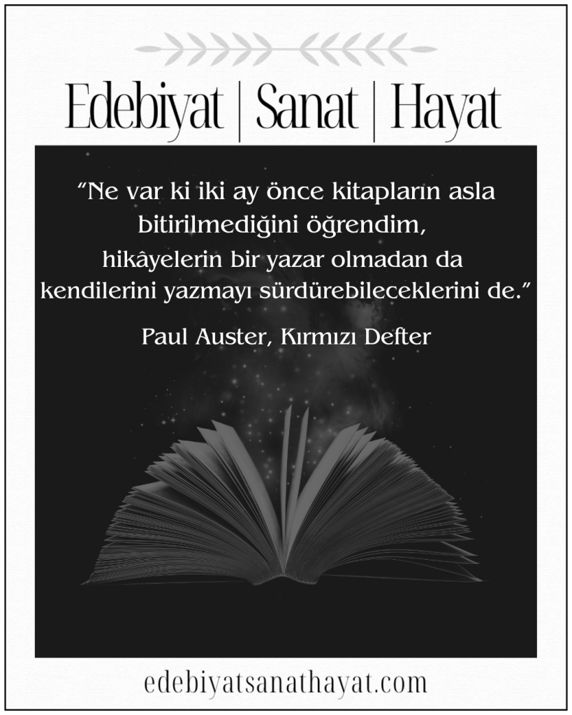 Kırmızı Defter’deki öyküler, Paul Auster’ın özel dünyasına girmek isteyenler için biçilmiş kaftan. New York Üçlemesi, Ay Sarayı, Şans Müziği, Timbuktu, Brooklyn Çılgınlıkları, Yazı Odasında Yolculuklar, Yükseklik Korkusu gibi yapıtlarında olağanüstü düş gücünü ortaya koyan Auster, bu kitabındaki öykülerde, ya gerçekten yaşadığı ve tanık olduğu ya da yakınlarından, dostlarından dinlediği gerçek olayları anlatıyor. Ama bu trajik ya da komik olayları öykülerken bir bakıma öteki yapıtlarının ipuçlarını sunuyor okurlarına. Kırmızı Defter’in anlatı sanatından sapmadan sunulmuş bir yazınsal manifesto olduğu da söylenebilir.