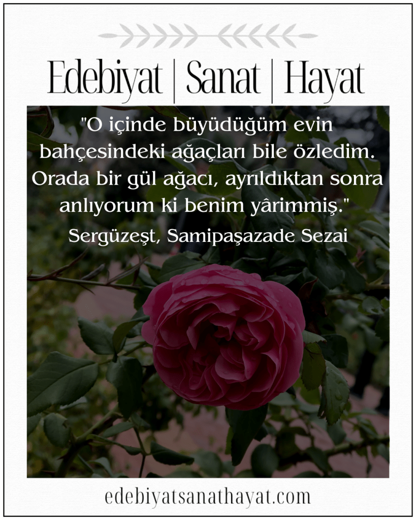 “O içinde büyüdüğüm evin bahçesindeki ağaçları bile özledim. Orada bir gül ağacı, ayrıldıktan sonra anlıyorum ki benim yârimmiş.” (Sayfa:42) Sergüzeşt, Samipaşazade Sezai