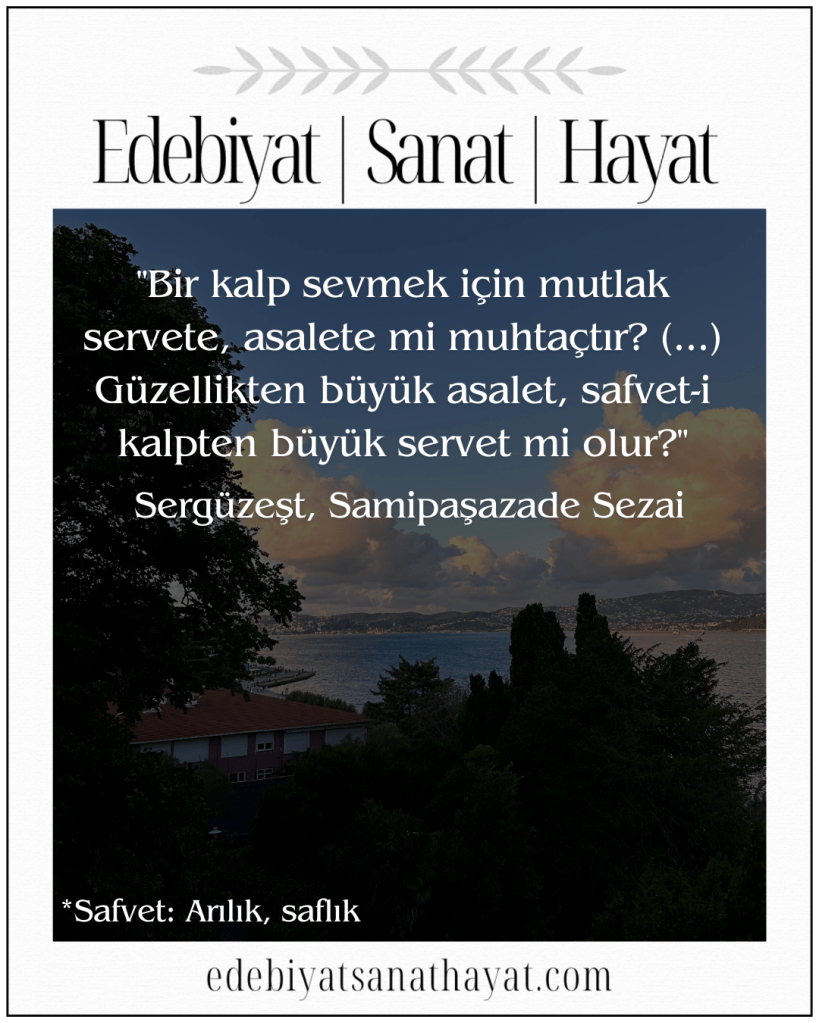 “Bir kalp sevmek için mutlak servete, asalete mi muhtaçtır? (…) Güzellikten büyük asalet, safvet-i kalpten büyük servet mi olur?” (Sayfa: 65) Sergüzeşt, Samipaşazade Sezai