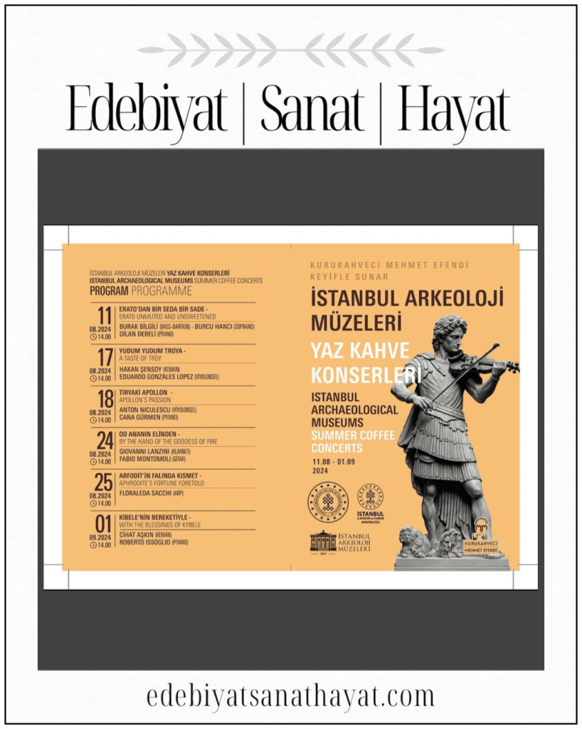 Kurukahveci Mehmet Efendi’nin desteğiyle İstanbul Arkeoloji Müzeleri’nde, 11 Ağustos – 1 Eylül 2024 tarihleri arasında düzenlenecek “Arkeoloji Müzesi Yaz Kahve Konserleri” sanatseverleri bekliyor.