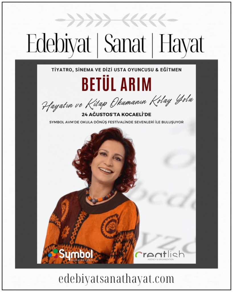 Duayen sanatçı, değerli eğitmen Betül Arım, 24 Ağustos’ta “Hayatın ve Kitap Okumanın Kolay Yolu” söyleşisiyle Symbol Alışveriş Merkezi Okula Dönüş Festivali’nde sevenleriyle buluşacak.