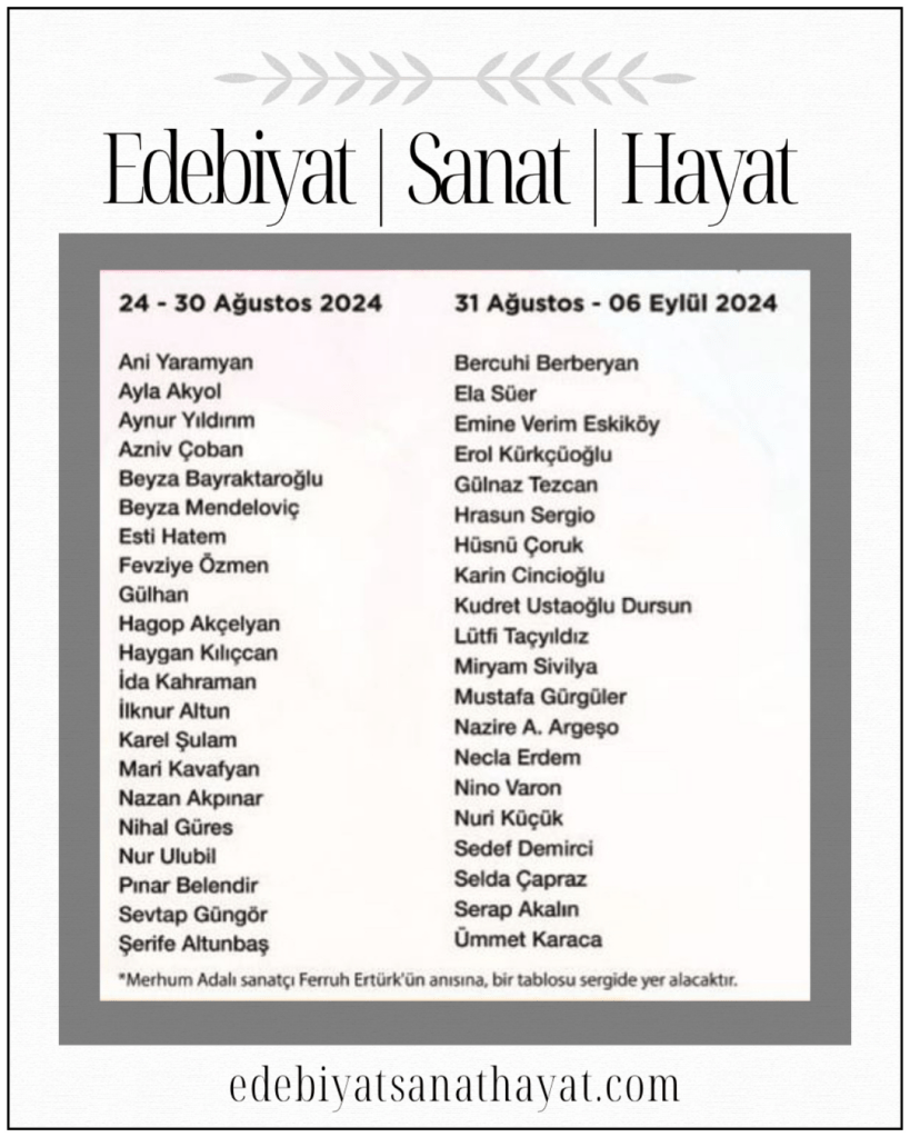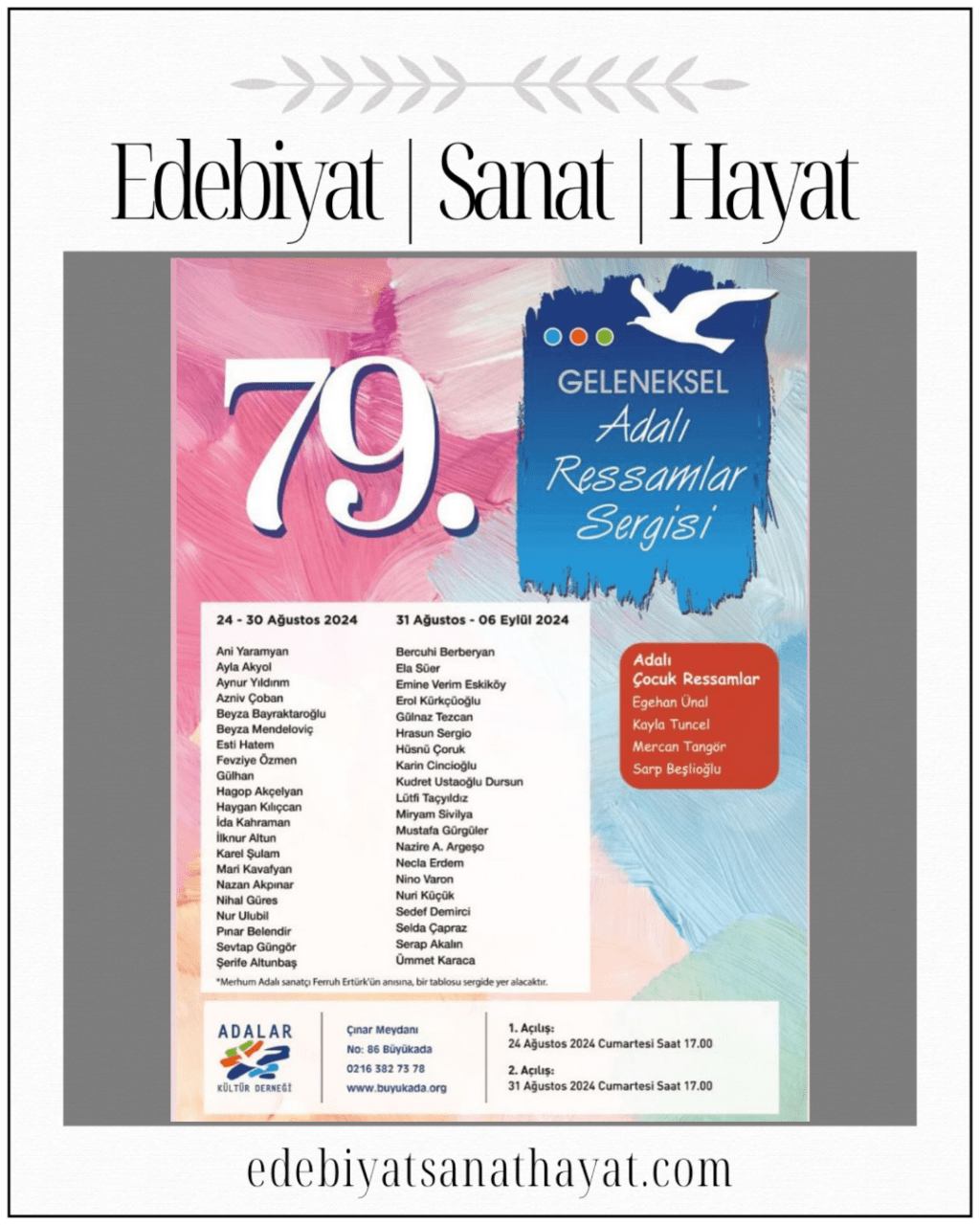 Adalar Kültür Derneği’nin 24-30 Ağustos ve 31 Ağustos-6 Eylül tarihleri arasında düzenlediği 79. Geleneksel Adalı Ressamlar Sergisi’ne sanatseverler davetlidir.