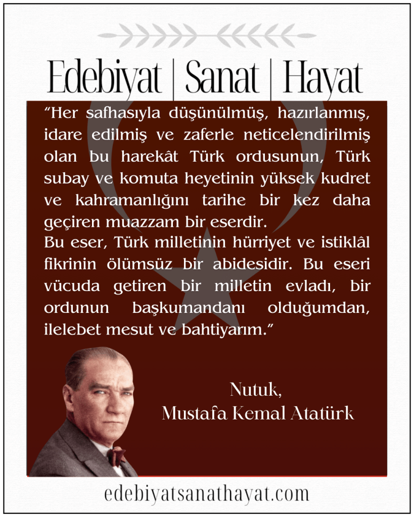 Bu eser, Türk milletinin hürriyet ve istiklâl fikrinin ölümsüz bir abidesidir. Bu eseri vücuda getiren bir milletin evladı, bir ordunun başkumandanı olduğumdan, ilelebet mesut ve bahtiyarım.”