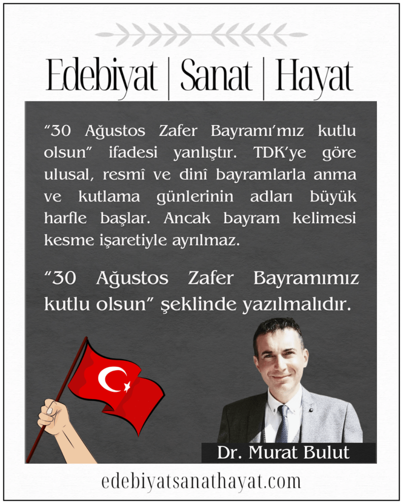 İletişim Bilimleri Doktoru Murat Bulut, 30 Ağustos Zafer Bayramını kutlarken sözcüklerin doğru yazılması hususunda Türkçe sevdalılarına yol gösteriyor.