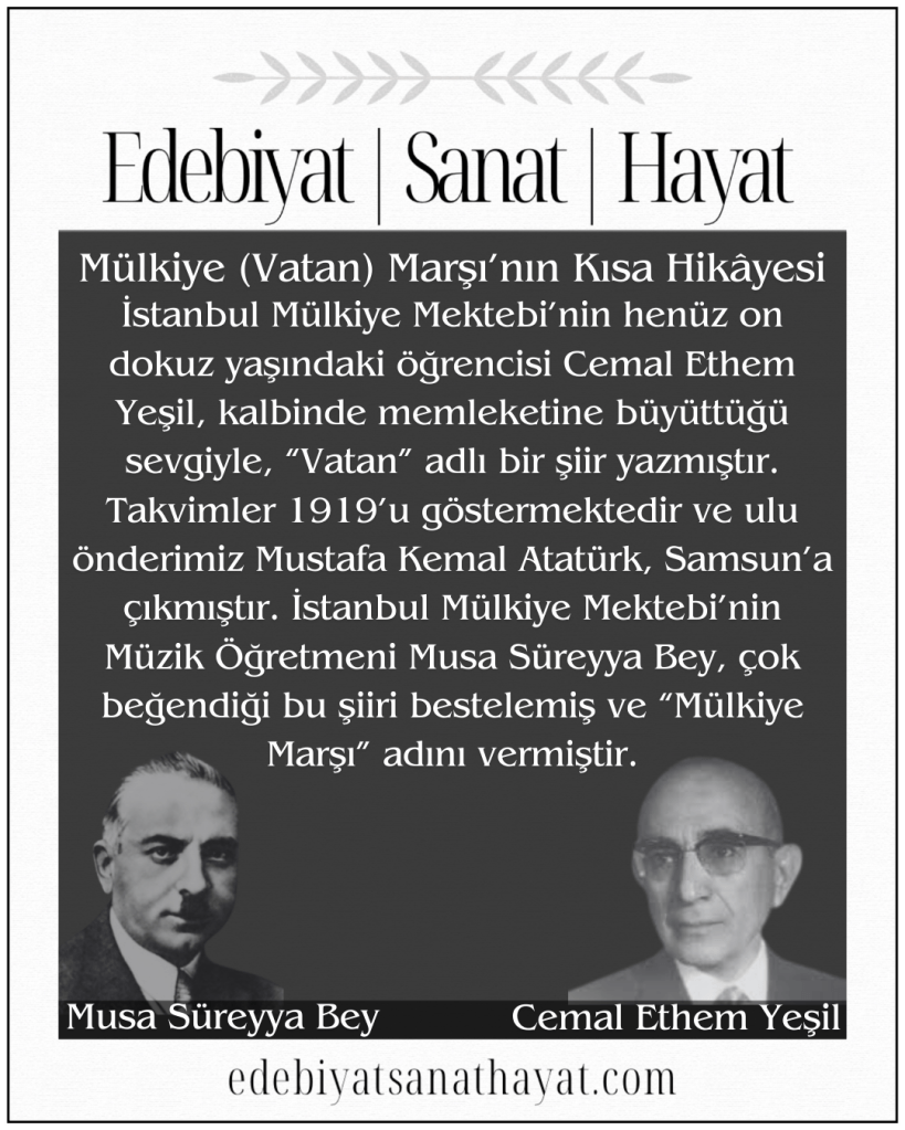 İstanbul Mülkiye Mektebi’nin henüz on dokuz yaşındaki öğrencisi Cemal Ethem Yeşil, kalbinde memleketine büyüttüğü sevgiyle “Vatan” adlı şiiri yazmıştır. O sırada takvimler 1919’u göstermektedir ve ulu önderimiz Mustafa Kemal Atatürk, Samsun’a çıkmıştır. İstanbul Mülkiye Mektebi’nin Müzik Öğretmeni Musa Süreyya Bey, bu şiiri çok beğenmiş, bestelemiş ve “Mülkiye Marşı” adını vermiştir.