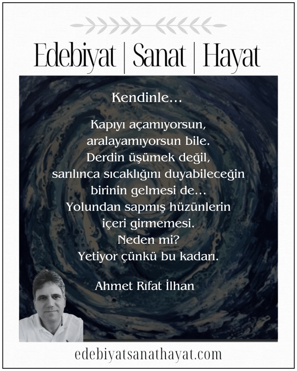 Ahmet Rıfat İlhan, 1971, Ankara doğumludur. Ortadoğu Teknik Üniversitesi Çevre Mühendisliği Bölümü lisans, Ankara Üniversitesi Toprak Bölümü lisansüstü mezunudur. Türkiye’yi, Birleşmiş Milletler Çevre Programı Akdeniz Eylem Planı çatısı altında on yıl boyunca temsil etmiştir. Hâlâ T.C. Tarım ve Orman Bakanlığı Su Yönetimi Genel Müdürlüğü’nde Tarım ve Orman Uzmanı olarak çalışmaktadır. Türkiye Su Bilimleri ve Yönetimi Dergisi ile Su Dergisi’nin imtiyaz sahibidir. Bilim Sanat Edebiyat Derneği (BİSED) üyesidir. Bilimsel ve teknik makale, kitap incelemesi, öykü ve şiir türündeki yazıları başta Varlık ve Şiirden dergileri olmak üzere birçok dergi, e-dergi, internet sitesiyle yarışma seçki kitaplarında yayımlanmıştır. Katıldığı öykü yarışmalarında çeşitli derece ve ödülleri bulunmaktadır. Çeşitli derleme kitaplarda yer almıştır. Huzurlu Kuşkular, 2022 yılında Klaros Yayınları’ndan çıkan ilk şiir kitabı. X Hâli, 2024 yılında Pikaresk Yayınevi’nden çıkan son şiir kitabıdır.