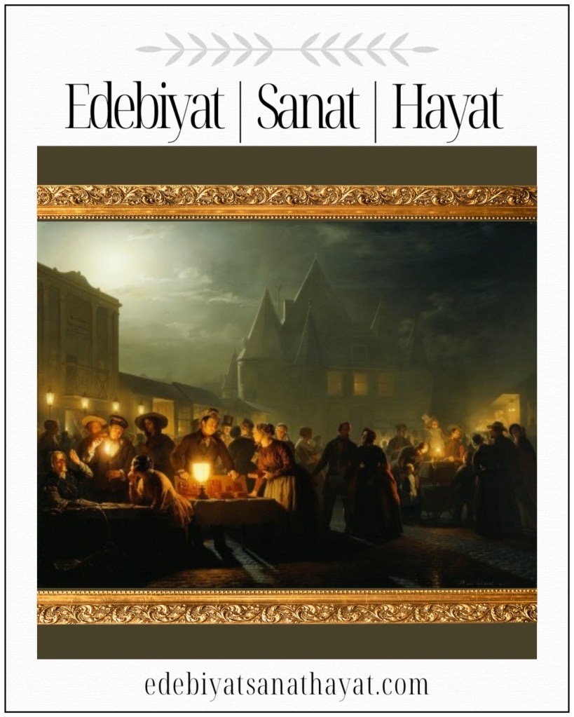 Kitap Fuarı resmi 1852 tarihlidir. Resimdeki ışık kaynaklarına bir bakalım… Mum, kandil, gazlı sokak lambaları gibi yapay ışık kaynaklarının yanında güçlü bir ay ışığı var. (Not: 18. ve 19. yüzyılda gece bir etkinlik yapılacaksa bu, mutlaka dolunay gecesine denk getirilmeye çalışılırdı ki insanlar at üstünde ya da at arabasıyla evlerine rahatça dönebilsinler…)