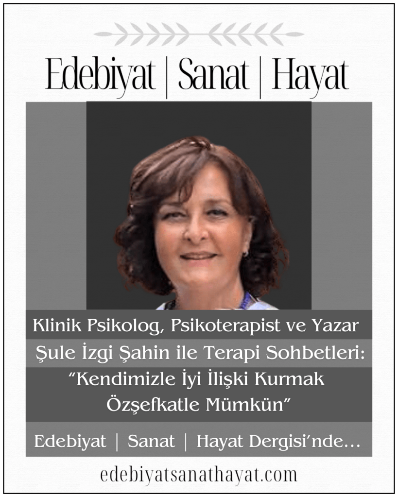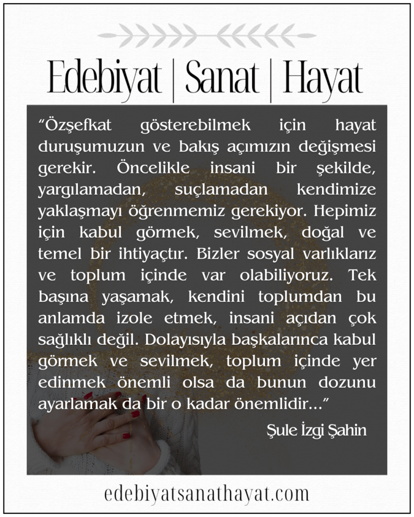 Psikolojik polisiye roman üçlemesi Kopmuş İp, Kocama Tuzak Kurdum, Kırmızı Kadifenin Sırrı eserleriyle tanınan, alanında benzersiz bir çalışma olan Romandrama’nın yazarı, ODTÜ Edebiyat Kulübü’nün kurucusu, Uzman Klinik Psikolog, Psikoterapist ve Yazar Şule İzgi Şahin; özşefkat kavramını, özşefkatin sonradan öğrenilip öğrenilmeyeceğini, ilişkiler üzerindeki etkilerine yönelik merak edilenleri yanıtladığı köşe yazısıyla Edebiyat I Sanat I Hayat Dergisi’nde…