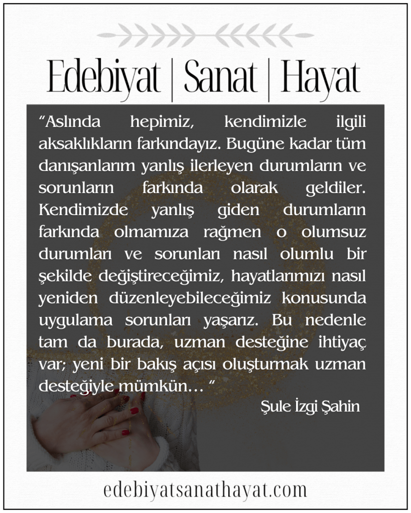 Aslında hepimiz, kendimizle ilgili aksaklıkların farkındayız. Bugüne kadar tüm danışanlarım yanlış ilerleyen durumların ve sorunların farkında olarak geldiler. Kendimizde yanlış giden durumların farkında olmamıza rağmen o olumsuz durumları ve sorunları nasıl olumlu bir şekilde değiştireceğimiz, hayatlarımızı nasıl yeniden düzenleyebileceğimiz konusunda uygulama sorunları yaşarız. Bu nedenle tam da burada, uzman desteğine ihtiyaç var; yeni bir bakış açısı oluşturmak uzman desteğiyle mümkün…