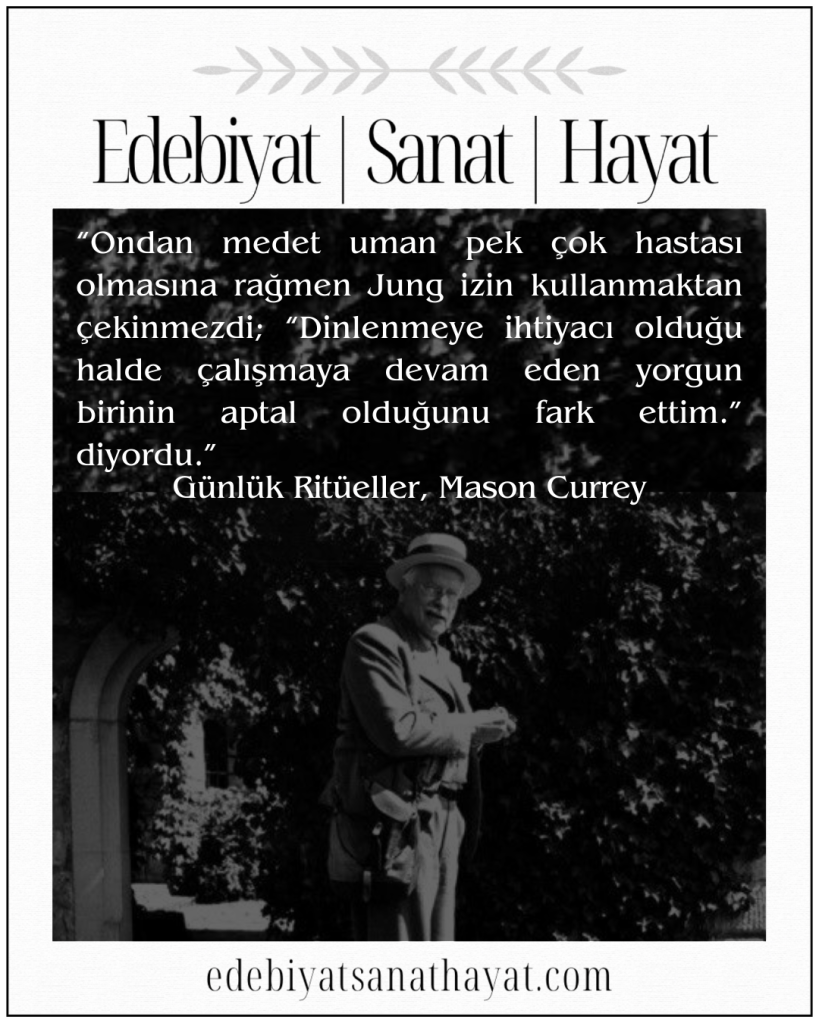 “Ondan medet uman pek çok hastası olmasına rağmen Jung izin kullanmaktan çekinmezdi; “Dinlenmeye ihtiyacı olduğu halde çalışmaya devam eden yorgun birinin aptal olduğunu fark ettim.” diyordu.”