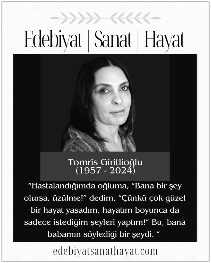 Yönetmen, senarist ve yapımcı Tomris Giritlioğlu altmış yedi yaşında aramızdan ayrıldı. Sinemaya genç yetenekler kazandıran, yakın tarihimizdeki acıları, kusurları gün yüzüne çıkarmaktan çekinmeyen, tekrarlanmamasını umarak yaptığı tüm işlerde toplumsal travmaları işleyen Tomris Giritlioğlu’nu saygıyla anıyoruz…