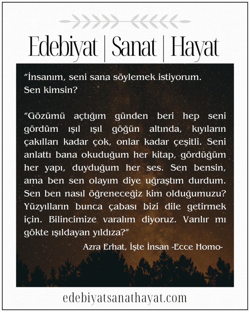 Gözümü açtığım günden beri hep seni gördüm ışıl ışıl göğün altında, kıyıların çakılları kadar çok, onlar kadar çeşitli. Seni anlattı bana okuduğum her kitap, gördüğüm her yapı, duyduğum her ses. Sen bensin, ama ben sen olayım diye uğraştım durdum. Sen ben nasıl öğreneceğiz kim olduğumuzu? Yüzyılların bunca çabası bizi dile getirmek için. Bilincimize varalım diyoruz. Varılır mı gökte ışıldayan yıldıza?”