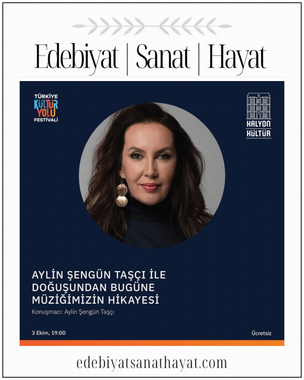 Değerli Ses Sanatçısı Doç. Dr. Aylin Şengün Taşçı, Türk Müziği’ne algılanandan farklı bir gözle bakılmasını sağlıyor. Hem kültürel bir program, hem de neşeli bir sunumu müzikle destekleyen şov niteliğindeki “Doğuşundan Bugüne Müziğimizin Hikayesi” İstanbul Kültür Yolu Festivali kapsamında bu akşam Kalyon Kültür’de…