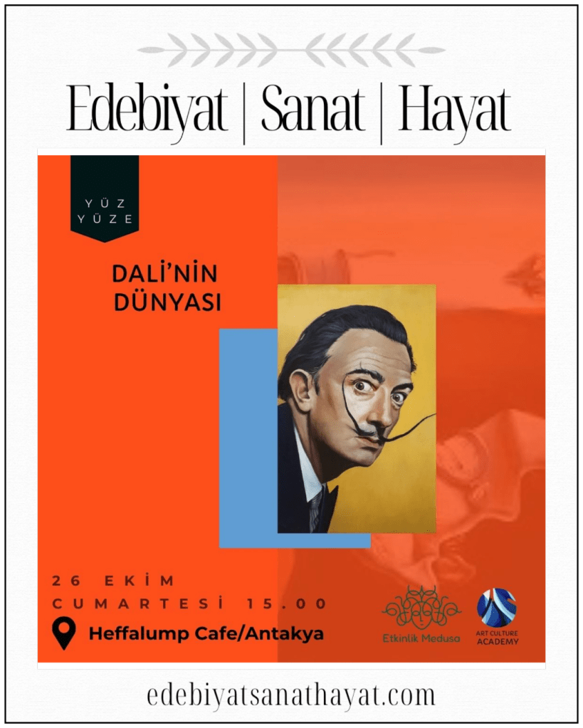 Art Culture Academy’nin kurucusu Rabia Çolak, Dali’nin Dünyası etkinliğiyle, Antakya’nın sanatla yeniden kalkındırılmasına katkı sunmak amacıyla, Heffalump Cafe’de sanatseverlerle buluşacak. “Etkinlik Medusa”nın iş birliği ve Rabia Çolak’ın anlatımıyla yapılacak atölyede Salvador Dali’nin hayatı tüm detaylarıyla katılımcılarla paylaşılacak.
