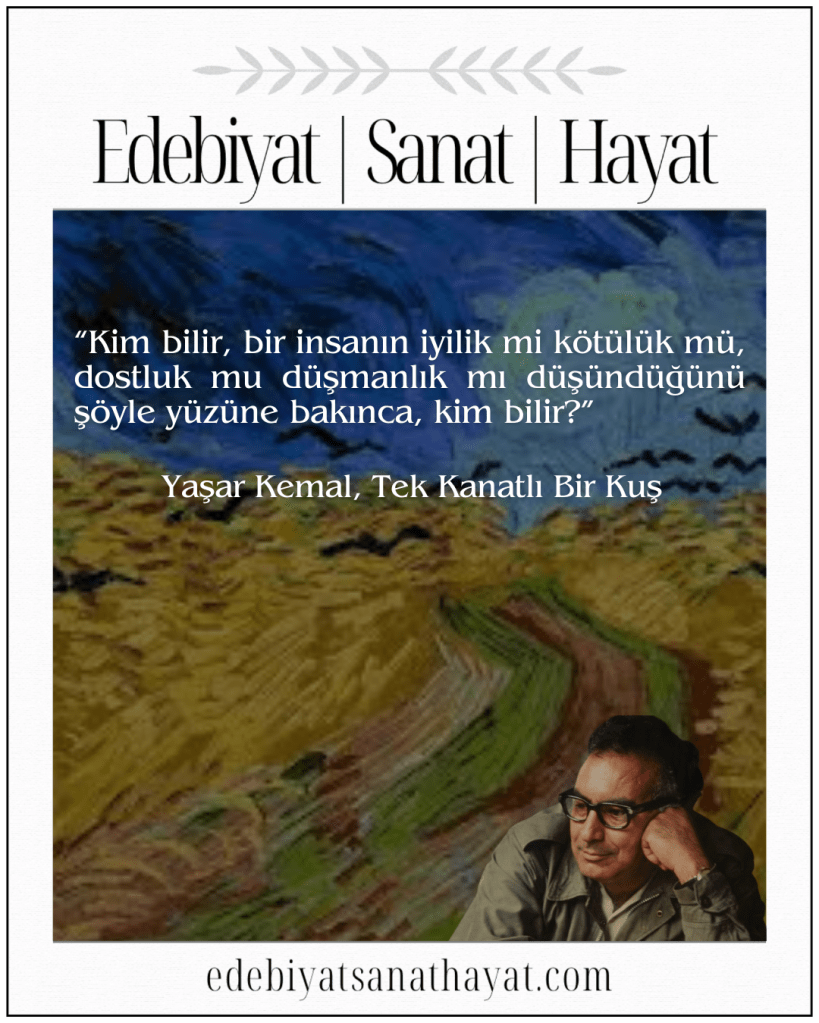 “Kitap Hakkında: Edebiyatımızın çınarı, büyük usta Yaşar Kemal’in Tek Kanatlı Bir Kuş kitabı, toplumda bulaşıcı bir hastalık gibi yayılan korkunun destansı bir romanı.