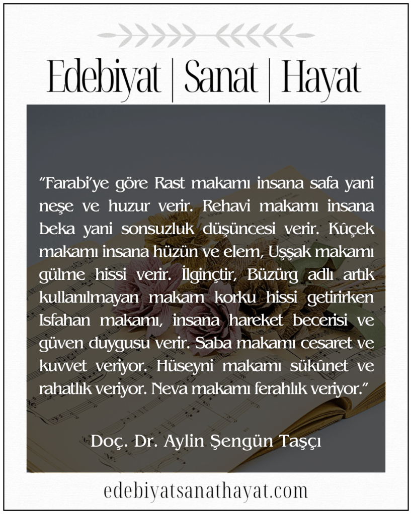 Farabi’nin çalışması, makamlara olan ilgisinin yanı sıra, Türk toplumunda müziğin günlük hayatın içine ne kadar derinden nüfuz ettiğini göstermesi açısından da çok değerlidir. Sanatın bugün de toplumumuza yüksek duygular verecek şekilde yaşatılması dileğiyle…