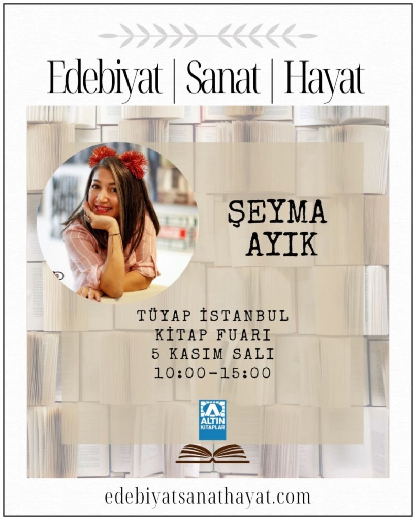 Tüyap Kitap Fuarı’nda okurları ve sevenleriyle buluşacak. 5 Kasım Salı günü, 10.00-15.00 saatleri arasında Altın Kitap standında, yayınlanmış eserleri, Babaannemin Sandığı, Tırtıl Tontini ve Neşeli Aydede, Aliş’in Öfkesi ve Üç Kuş Kardeş kitaplarını imzalayacak.
