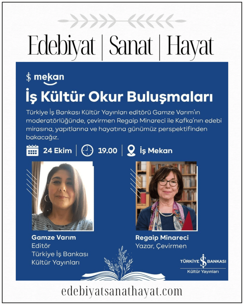 Kafka’nın ölümünün 100. yıl dönümü olan 2024’ün “Kafka Yılı” seçilmesi vesilesiyle, ilk konuk, Şato, Amerika, Babaya Mektup, Ottla’ya ve Aileye Mektuplar eserlerini ve Reiner Stach’ın “Bu Kafka mı?” kitabını Almancadan dilimize kazandırmasıyla tanınan çevirmen Regaip Minareci olacak.