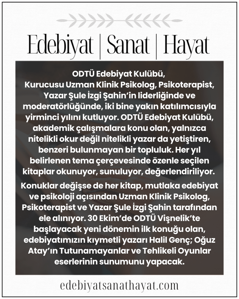 ODTÜ Edebiyat Kulübü, Kurucusu Uzman Klinik Psikolog, Psikoterapist ve Yazar Şule İzgi Şahin’in liderliğinde ve moderatörlüğünde iki bine yakın katılımcısıyla yirminci yılını kutluyor. ODTÜ Edebiyat Kulübü, akademik çalışmalara konu olan, yalnızca nitelikli okur değil, nitelikli yazar da yetiştiren, benzeri bulunmayan bir topluluk. Her yıl belirlenen tema çerçevesinde özenle seçilen kitaplar okunuyor, sunuluyor, değerlendiriliyor. Konuklar değişse de her kitap mutlaka edebiyat ve psikoloji açısından Uzman Klinik Psikolog, Psikoterapist ve Yazar Şule İzgi Şahin tarafından ele alınıyor. 30 Ekim’de ODTÜ Vişnelik’te başlayacak yeni dönemin ilk konuğu olan, edebiyatımızın kıymetli yazarı Halil Genç; Oğuz Atay’ın Tutunamayanlar ve Tehlikeli Oyunlar eserlerinin sunumunu yapacak…