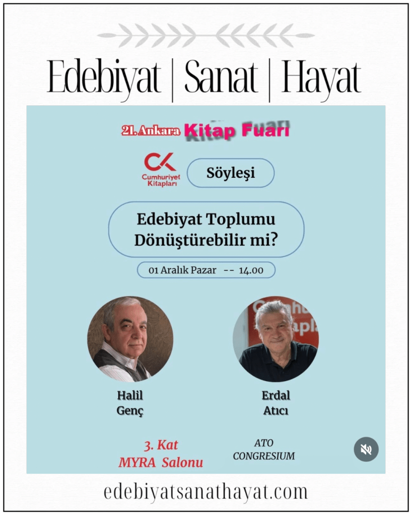 Senden Bir Ben, Koyabilmek Adını, Heranuş, Damlalar ve Orhan Kemal Öykü Ödüllü Kızıma Bir Yağmur Bulmalıyım eserleriyle ilgiyle takip edilen, edebiyatımızın kıymetli yazarı Halil Genç ile Güvercinler, O Karlı Kış Gecesi, Köy Enstitülerine Saldırılar Tarihi, Evimizin Duvarları eserleriyle tanınan değerli yazar Erdal Atıcı; “Edebiyat Toplumu Değiştirebilir mi?” söyleşisiyle 21. Ankara Kitap Fuarı’nda Ankaralı okurlarla buluşacaklar. Etkinlik, 01 Aralık Pazar günü saat 14.00’te ATO CONGRESIUM MYRA Salonu 3. Kat’ta yapılacak.