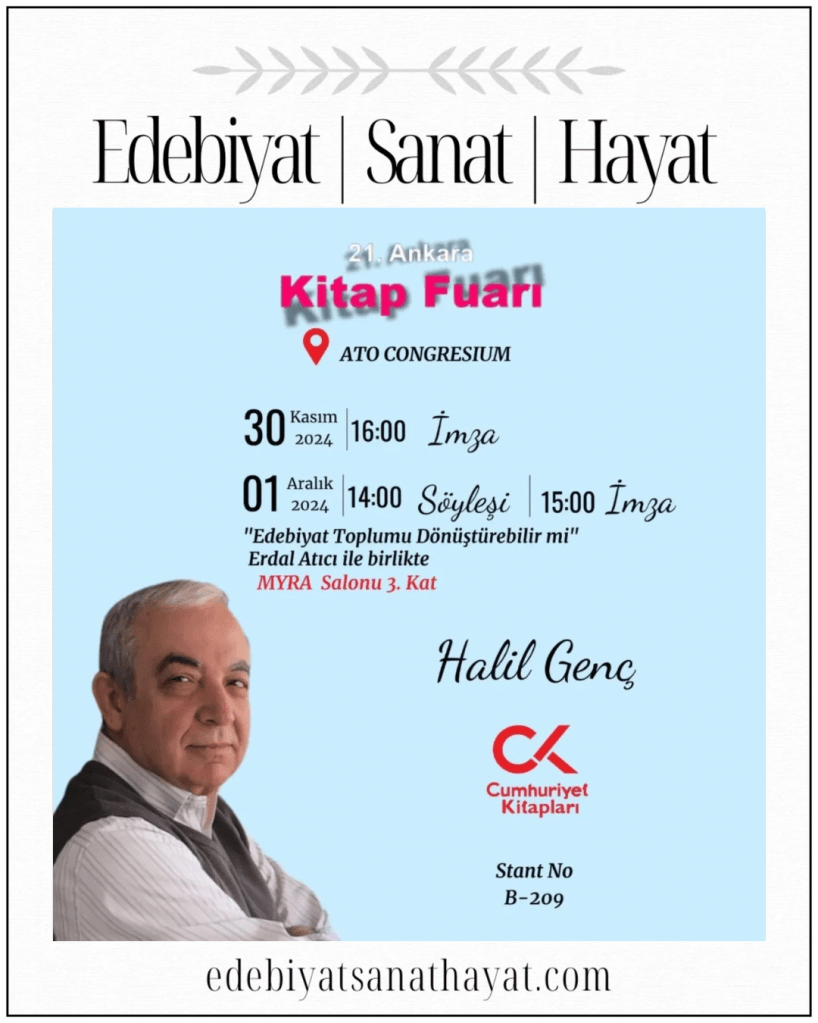 Kıymetli Yazar Halil Genç, 21. Ankara Kitap Fuarı’nda 30 Kasım Cumartesi günü saat: 16.00’da, 1 Aralık Pazar günü saat: 15.00’te Cumhuriyet Kitapları standında okurlarıyla buluşacak.
