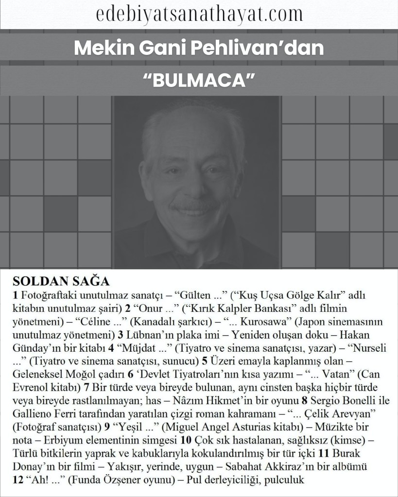 Usta Bulmaca Yazarı Mekin Gani Pehlivan, edebiyatın, sanatın, hayatın içinden eşsiz bulmacalarıyla Edebiyat Sanat Hayat Dergisi’nde.