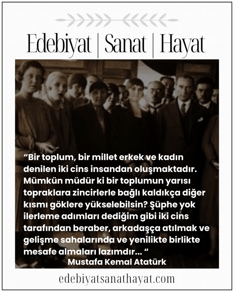 “Bir toplum, bir millet erkek ve kadın denilen iki cins insandan oluşmaktadır. Mümkün müdür ki bir toplumun yarısı topraklara zincirlerle bağlı kaldıkça diğer kısmı göklere yükselebilsin? Şüphe yok ilerleme adımları dediğim gibi iki cins tarafından beraber, arkadaşça atılmak ve gelişme sahalarında ve yenilikte birlikte mesafe almaları lazımdır… “