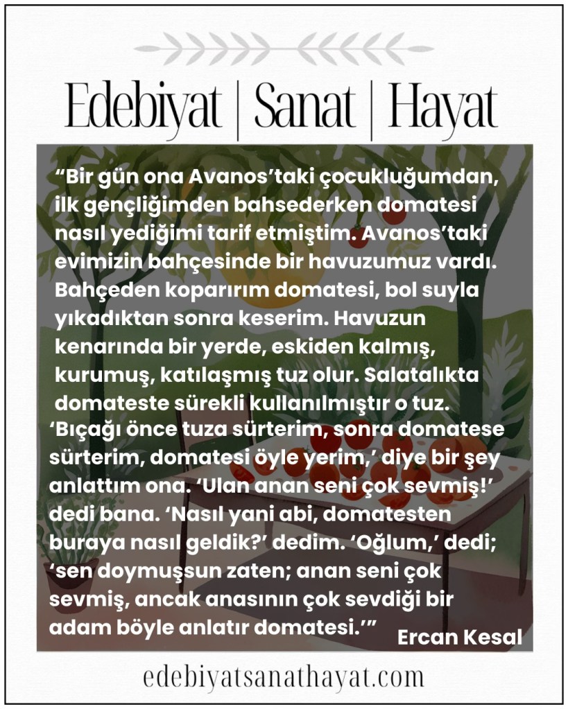 “Bir gün ona Avanos’taki çocukluğumdan, ilk gençliğimden bahsederken domatesi nasıl yediğimi tarif etmiştim. Avanos’taki evimizin bahçesinde bir havuzumuz vardı. Bahçeden koparırım domatesi, bol suyla yıkadıktan sonra keserim. Havuzun kenarında bir yerde, eskiden kalmış, kurumuş, katılaşmış tuz olur. Salatalıkta domateste sürekli kullanılmıştır o tuz. ‘Bıçağı önce tuza sürterim, sonra domatese sürterim, domatesi öyle yerim,’ diye bir şey anlattım ona. ‘Ulan anan seni çok sevmiş!’ dedi bana. ‘Nasıl yani abi, domatesten buraya nasıl geldik?’ dedim. ‘Oğlum,’ dedi; ‘sen doymuşsun zaten; anan seni çok sevmiş, ancak anasının çok sevdiği bir adam böyle anlatır domatesi.’” Ercan Kesal