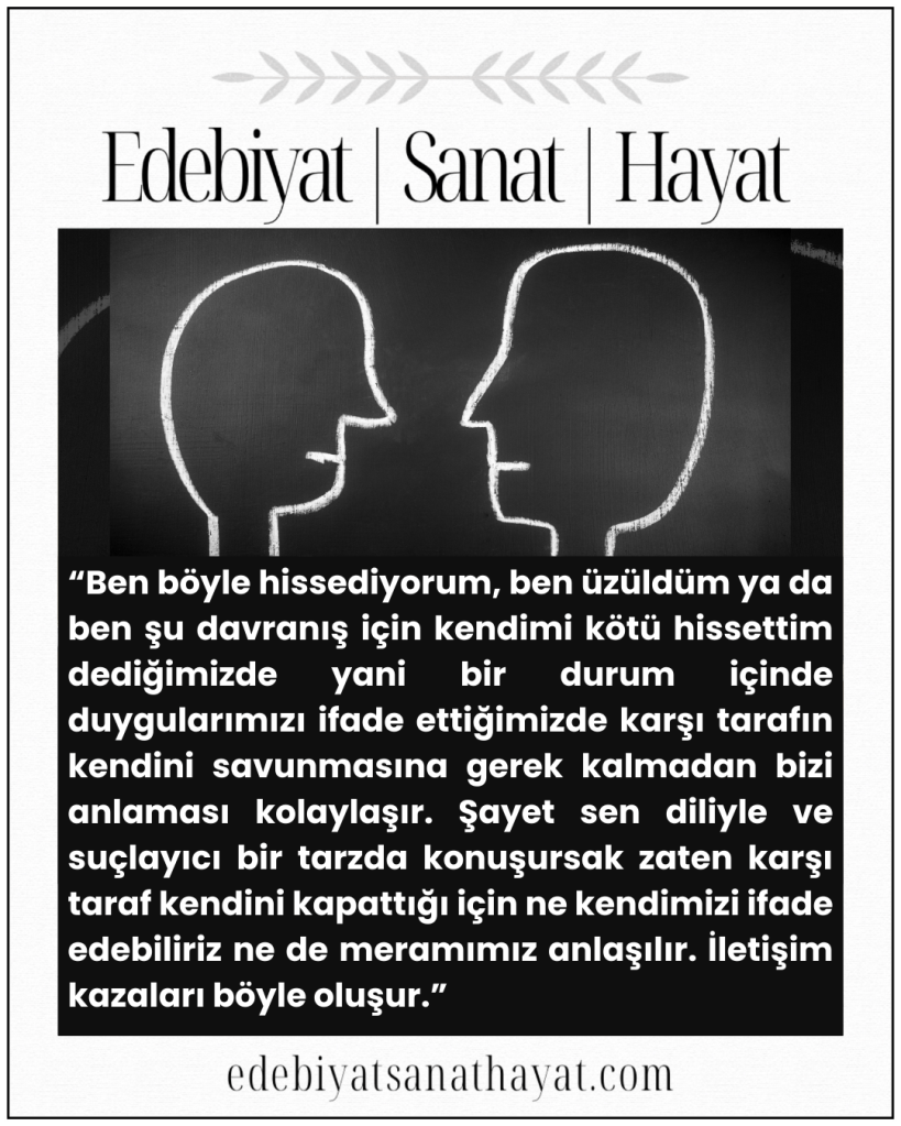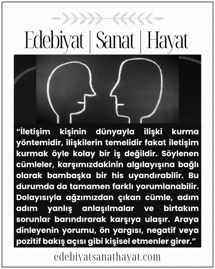İletişim kişinin dünyayla ilişki kurma yöntemidir, ilişkilerin temelidir fakat iletişim kurmak öyle kolay bir iş değildir. Söylenen cümleler, karşımızdakinin algılayışına bağlı olarak bambaşka bir his uyandırabilir. Bu durumda da tamamen farklı yorumlanabilir. Dolayısıyla ağzımızdan çıkan cümle, adım adım yanlış anlaşılmalar ve birtakım sorunlar barındırarak karşıya ulaşır. Araya dinleyenin yorumu, ön yargısı, negatif veya pozitif bakış açısı gibi kişisel etmenler girer. Dinleyen söylediklerimizin ardında başka bir mana arayarak dinliyorsa veya konuyla ilgili olumsuz bir düşüncesi varsa, konuşma çok da başarılı geçmez. Bütün bunlar, daha ilk cümle ağzımızdan çıkarken karşımızdaki kişinin bilinçaltında çeşitli yerlere yerleşmiş olur. Dolayısıyla iletişim kurarken kullandığımız kelimeler çok önemlidir ve duyarlı olmak gerekir. Bu duyarlılık kişiden topluma sirayet ederse iletişim kazaları dediğimiz durumun önüne geçilebilir.
