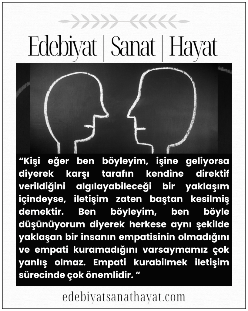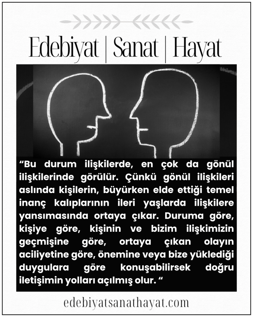 Bu durum ilişkilerde, en çok da gönül ilişkilerinde görülür. Çünkü gönül ilişkileri aslında kişilerin, büyürken elde ettiği temel inanç kalıplarının ileri yaşlarda ilişkilere yansımasında ortaya çıkar. Duruma göre, kişiye göre, kişinin ve bizim ilişkimizin geçmişine göre, ortaya çıkan olayın aciliyetine göre, önemine veya bize yüklediği duygulara göre konuşabilirsek doğru iletişimin yolları açılmış olur. Kişi eğer ben böyleyim, işine geliyorsa diyerek karşı tarafın kendine direktif verildiğini algılayabileceği bir yaklaşım içindeyse, iletişim zaten baştan kesilmiş demektir. Ben böyleyim, ben böyle düşünüyorum diyerek herkese aynı şekilde yaklaşan bir insanın empatisinin olmadığını ve empati kuramadığını varsaymamız çok yanlış olmaz. Empati kurabilmek iletişim sürecinde çok önemlidir. Karşı tarafı ne kadar hissedebilirsek, ilgili durumun içindeki hâlini, geçmişine dair kırılganlığını anlayabilirsek ve olaya-kişiye verdiğimiz önemi de fark ettirebileceğimiz kelimeleri seçerek duyarlı ve düzgün bir şekilde konuşabilirsek iletişim kazaları minimuma iner ve yanlış anlaşılmalar azalır.