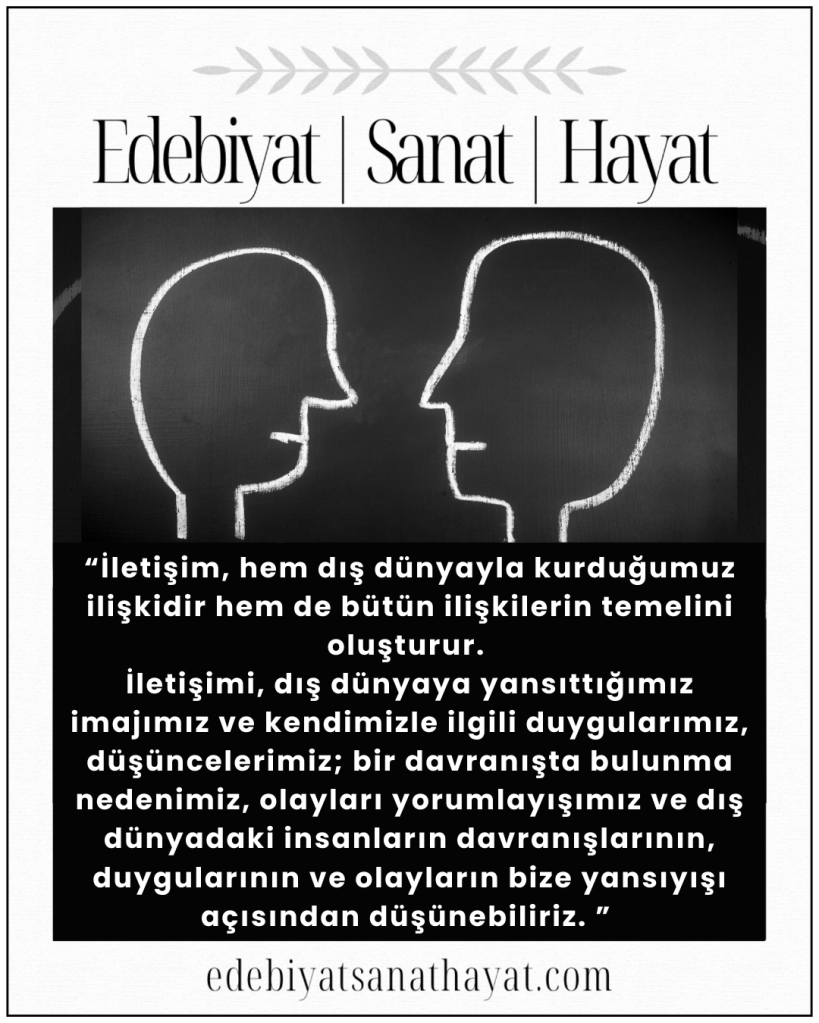 İletişim, hem dış dünyayla kurduğumuz ilişkidir hem de bütün ilişkilerin temelini oluşturur. İletişimi, dış dünyaya yansıttığımız imajımız ve kendimizle ilgili duygularımız, düşüncelerimiz; bir davranışta bulunma nedenimiz, olayları yorumlayışımız ve dış dünyadaki insanların davranışlarının, duygularının ve olayların bize yansıyışı açısından düşünebiliriz.