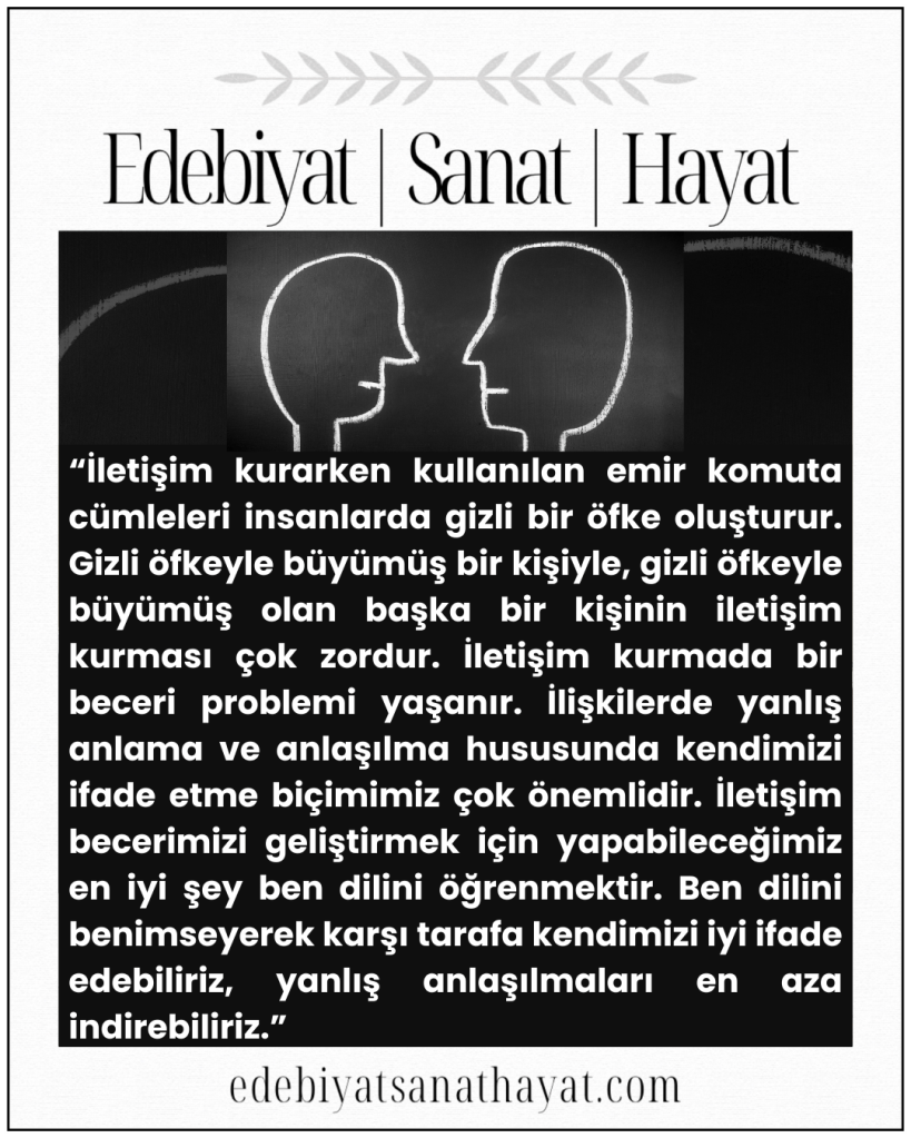 İletişim kurarken kullanılan emir komuta cümleleri insanlarda gizli bir öfke oluşturur. Gizli öfkeyle büyümüş bir kişiyle, gizli öfkeyle büyümüş olan başka bir kişinin iletişim kurması çok zordur. İletişim kurmada bir beceri problemi yaşanır. İlişkilerde yanlış anlama ve anlaşılma hususunda kendimizi ifade etme biçimimiz çok önemlidir. İletişim becerimizi geliştirmek için yapabileceğimiz en iyi şey ben dilini öğrenmektir. Ben dilini benimseyerek karşı tarafa kendimizi iyi ifade edebiliriz, yanlış anlaşılmaları en aza indirebiliriz. Ben böyle hissediyorum, ben üzüldüm ya da ben şu davranış için kendimi kötü hissettim dediğimizde yani bir durum içinde duygularımızı ifade ettiğimizde karşı tarafın kendini savunmasına gerek kalmadan bizi anlaması kolaylaşır. Şayet sen diliyle ve suçlayıcı bir tarzda konuşursak zaten karşı taraf kendini kapattığı için ne kendimizi ifade edebiliriz ne de meramımız anlaşılır. İletişim kazaları böyle oluşur.