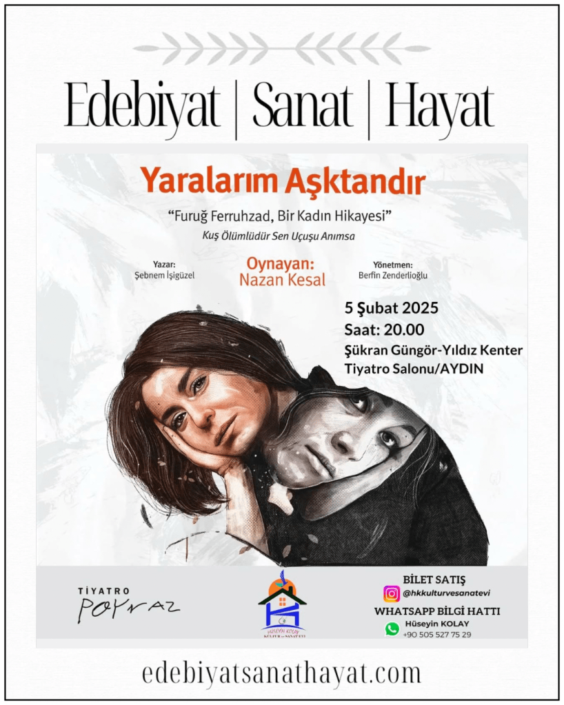 Nazan Kesal “Yaralarım Aşktandır” adlı tek kişilik oyunuyla, İran’ın güçlü kadın şairi Füruğ Ferruhzad’ı oynuyor. Yazar Şebnem İşigüzel’in kaleme aldığı ve Berfin Zenderlioğlu’nun yönettiği oyun, İran şiirinin isyankâr sesi Füruğ Ferruhzad’ın nefesini, tiyatro sahnesine taşıyor.