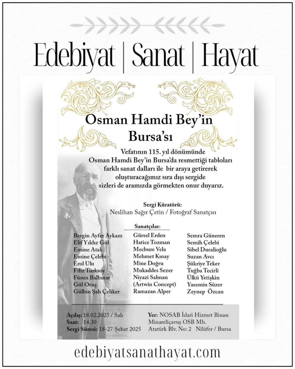 Türk resim sanatının önemli isimlerinden Ressam, Müze Müdürü, Arkeolog Osman Hamdi Bey, vefatının 115. yılında “Osman Hamdi Bey’in Bursa’sı Sergisi”yle anılıyor. Bursa’nın tarihî mekânlarını resmeden sanatçının eserleri, farklı sanat dallarıyla yeniden yorumlanarak sanatseverlerin izlenimine sunuluyor.