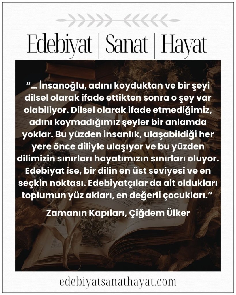 “… İnsanoğlu, adını koyduktan ve bir şeyi dilsel olarak ifade ettikten sonra o şey var olabiliyor. Dilsel olarak ifade etmediğimiz, adını koymadığımız şeyler bir anlamda yoklar. Bu yüzden insanlık, ulaşabildiği her yere önce diliyle ulaşıyor ve bu yüzden dilimizin sınırları hayatımızın sınırları oluyor. Edebiyat ise, bir dilin en üst seviyesi ve en seçkin noktası. Edebiyatçılar da ait oldukları toplumun yüz akları, en değerli çocukları.” (S.19)