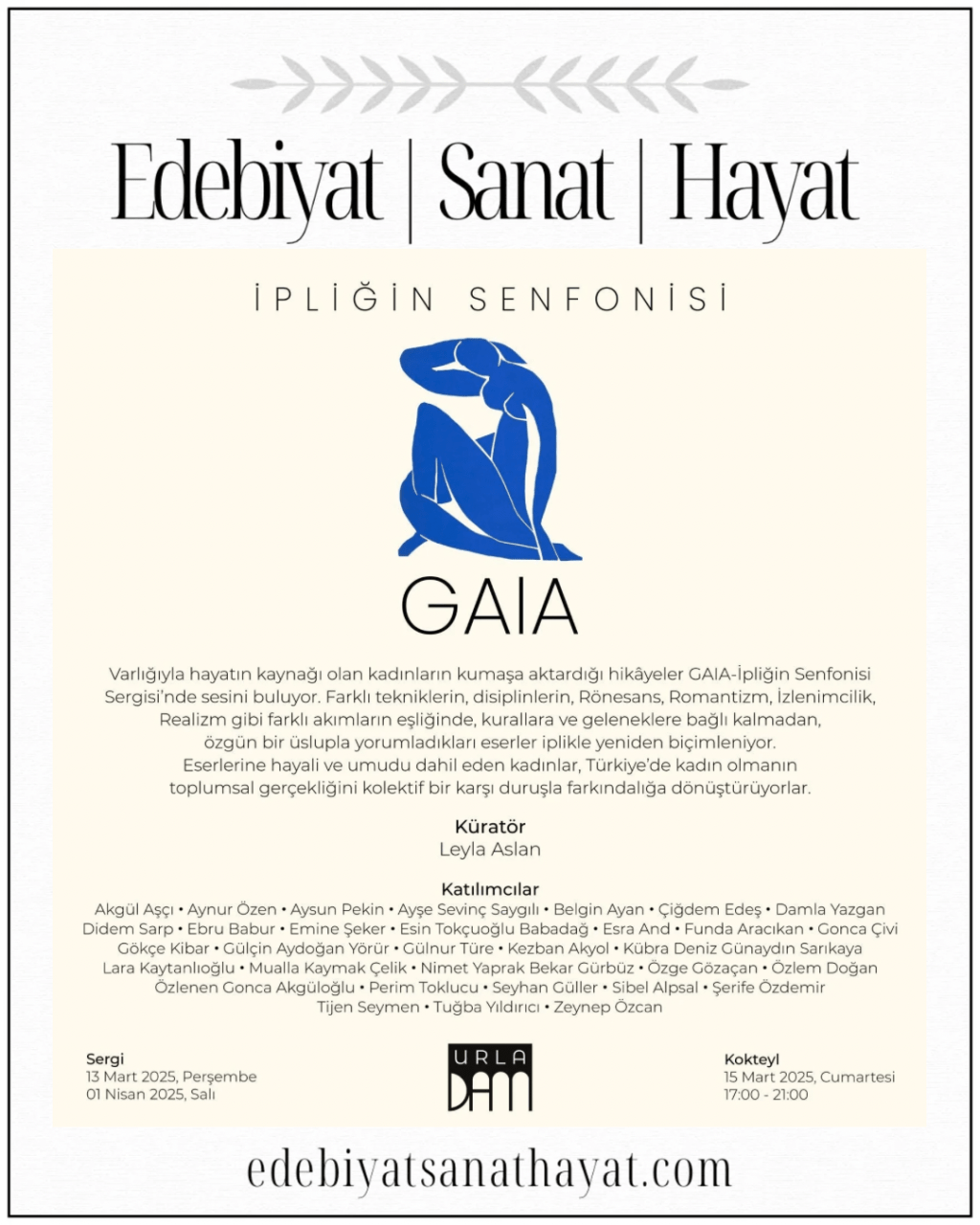 Varlığıyla hayatın kaynağı olan kadınların kumaşa aktardığı hikâyeler, GAIA – İpliğin Senfonisi Sergisi’nde görünür kılınıyor. Farklı disiplinlerden ve sanat akımlarından beslenen, özgün bir üslupla yorumlanan eserler, iplik aracılığıyla yeniden biçimleniyor. Kadın sanatçıların yaratıcılığını ve kolektif dayanışmasını görünür kılan sergi, 13 Mart – 1 Nisan 2025 tarihleri arasında UrlaDAM’da sanatseverlerle buluşacak.