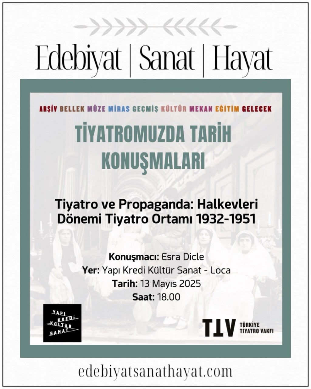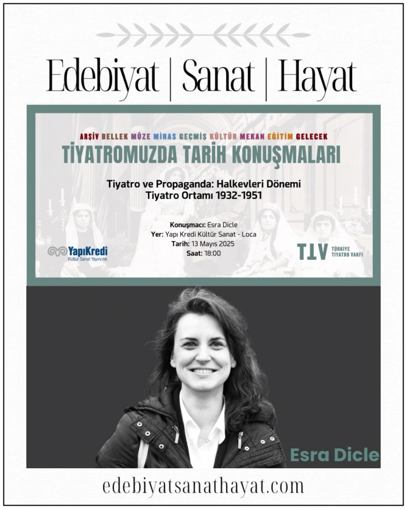 Türkiye Tiyatro Vakfı’nın (TTV) “Tiyatromuzda Tarih Konuşmaları” dizisi Esra Dicle’nin “Tiyatro ve Propaganda: Halkevleri Dönemi Tiyatro Ortamı 1932-1951” başlıklı konuşmasıyla devam ediyor. 13 Mayıs Salı günü saat 18.00’de Yapı Kredi Kültür Sanat Loca Salonu’nda gerçekleşecek oturumun moderatörlüğünü Noyan Ayturan üstleniyor.