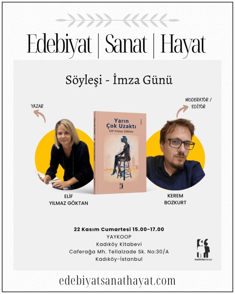 Yazar Elif Yılmaz Göktan, Yarın Çok Uzaktı kitabının yayımlanmasının ardından ilk okur etkinliğini, 22 Kasım Cumartesi günü Yaykoop Kadıköy Kitabevi’nde gerçekleştirecek. Söyleşi ve imza buluşmasında Editör Kerem Bozkurt ile bir araya gelerek kitabın ortaya çıkış sürecini, yaratıcı süreçlerini edebiyatseverlerle paylaşacaklar.